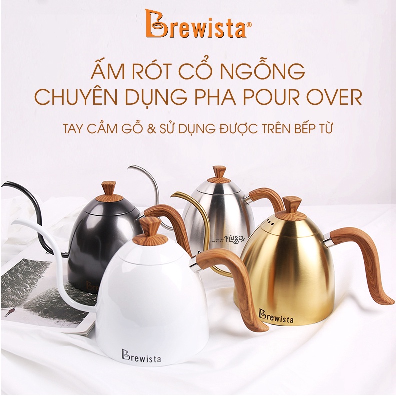 Ấm cổ ngỗng Brewista với thiết kế vòng cổ ngỗng siêu nhỏ, giúp việc điều tiết và rót dòng được đều, nhỏ, và dễ dàng hơn. Tay cầm được thiết kế giả gỗ, cong vát nhẹ, giúp người dùng thuận tiện hơn trong việc cầm rót, nhưng vẫn không làm hạn chế khả năng di chuyển của tay cầm. Dung tích 700ml, giúp người dùng thoải mái sử dụng, nhưng cũng không quá nặng khiến cho việc cầm ấm trở nên khó khăn hơn.