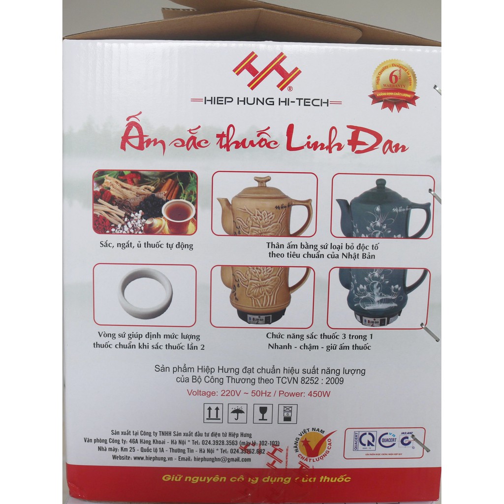 ❤️ Ấm Sắc thuốc Cao Cấp Linh Đan Hiệp Hưng Dung tích 3.2L ❤️Công ty TNHH sản xuất đầu tư điện tử Hiệp Hưng được thành lập từ năm 1999, là đơn vị đầu tiên sản xuất ấm sắc thuốc cũng như đồ điện tử gia dụng tại Việt Nam. Công ty đã có nhiều năm liền đạt danh hiệu “Hàng Việt Nam chất lượng cao”, Top 500 Doanh nghiệp lớn nhất Việt Nam, Huy chương vàng Hội chợ hàng công nghiệp Việt Nam, giải thưởng Quả Cầu Vàng, Bông Sen Vàng, danh hiệu cao quý Bạch Thái Bưởi do Nhà nước trao tặng… nên các bạn có thể yên tâm sử dụng các sản phẩm của Công ty.