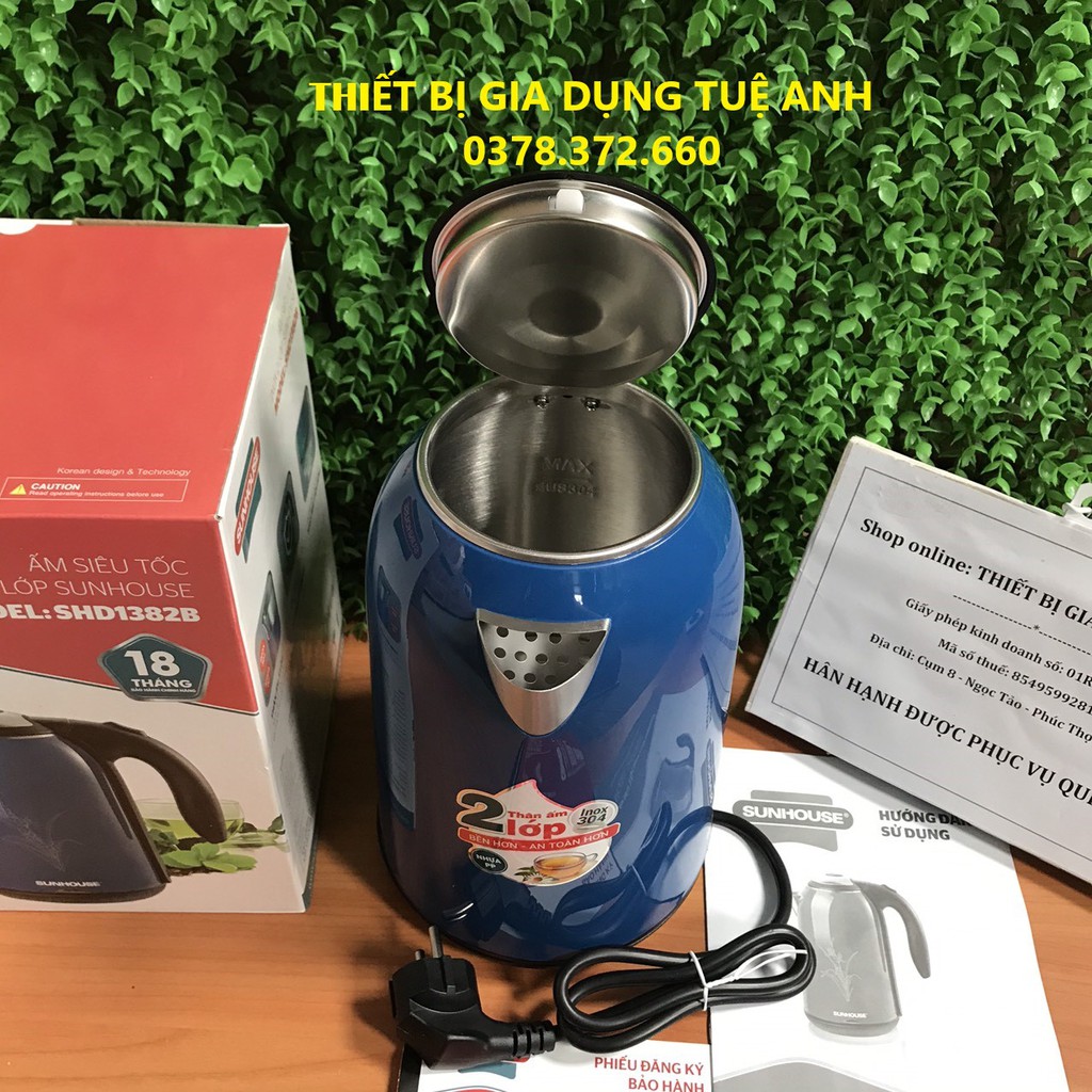 - Nổi bật với thiết kế trang nhã và màu sắc trẻ trung, ấm siêu tốc inox 2 lớp 1.7 L SUNHOUSE SHD1382R SHD1382B có màu xanh lam là sự lựa chọn phù hợp cho những căn bếp hiện đại. Ấm có dung tích lớn 1.7 lít cùng công suất hoạt động cao (1800W) giúp việc đun nước nhanh chóng hơn, tiết kiệm thời gian và điện năng tối đa.*** ĐẶC ĐIỂM NỔI BẬT của Ấm siêu tốc CAO CẤP inox 2 lớp 1.7 L SUNHOUSE - SHD1382B (bình đun siêu tốc Sunhouse SHD1382B)