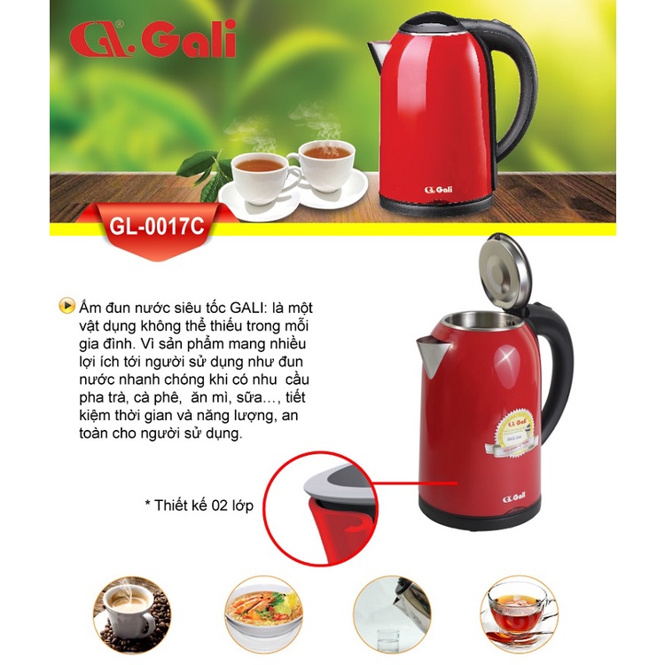 - Ấm siêu tốc 1.7 lít Gali GL-0017C Tuyệt đối an toàn về điện, hợp vệ sinh, đảm bảo sức khỏe.