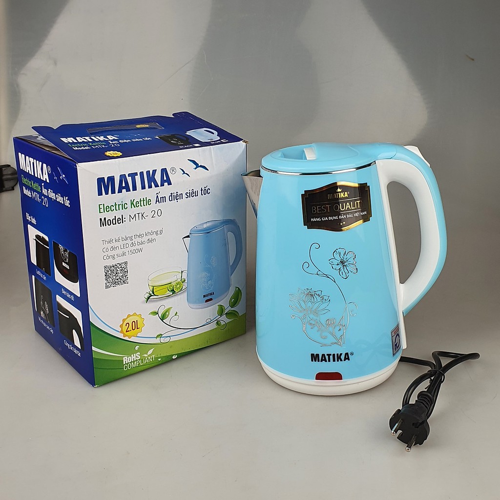 Ấm siêu tốc 2 lớp cách nhiệt Matika MTK-20 lòng ấm inox 304 (Màu ngẫu nhiên), bảo hành 12 tháng