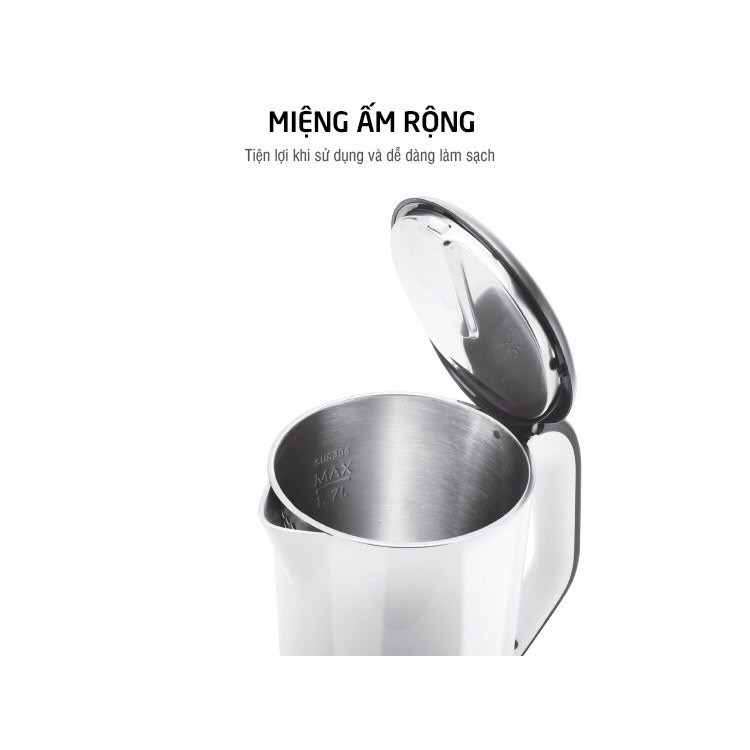 * Kiểu dáng mới lạ và không kém phần hiện đại với vẻ ngoài sang trọng. Bình được hoạt động với công suất mạnh mẽ 1800W và trang bị nút bật màu đen sử dụng cực đơn giản. Dung tích bình lên đến 1.7L giúp bạn có đủ lượng nước để đáp ứng cho nhiều nhu cầu sử dụng khác nhau trong cuộc sống như pha mì, pha trà, cà phê.