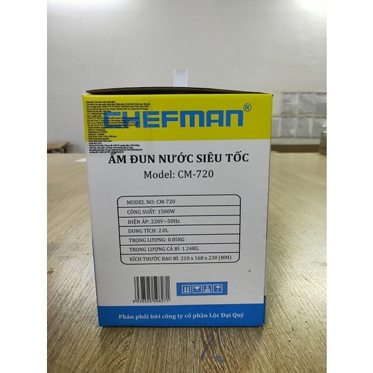 - Ấm siêu tốc Chefman CM-720 hoạt động với công suất 1500W, sử dụng nguồn điện áp 220V/50Hz giúp đun nước sôi rất nhanh, chỉ sau vài phút là đã có nước nóng để pha mì, pha trà hay pha sữa cho bé....