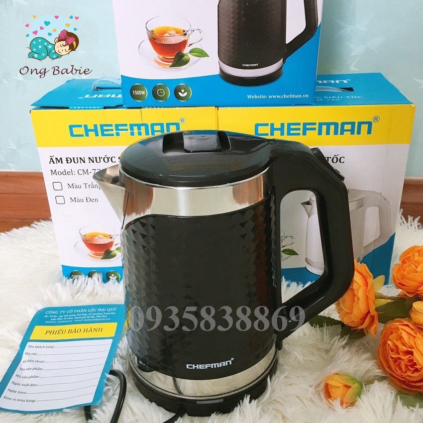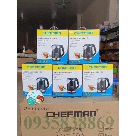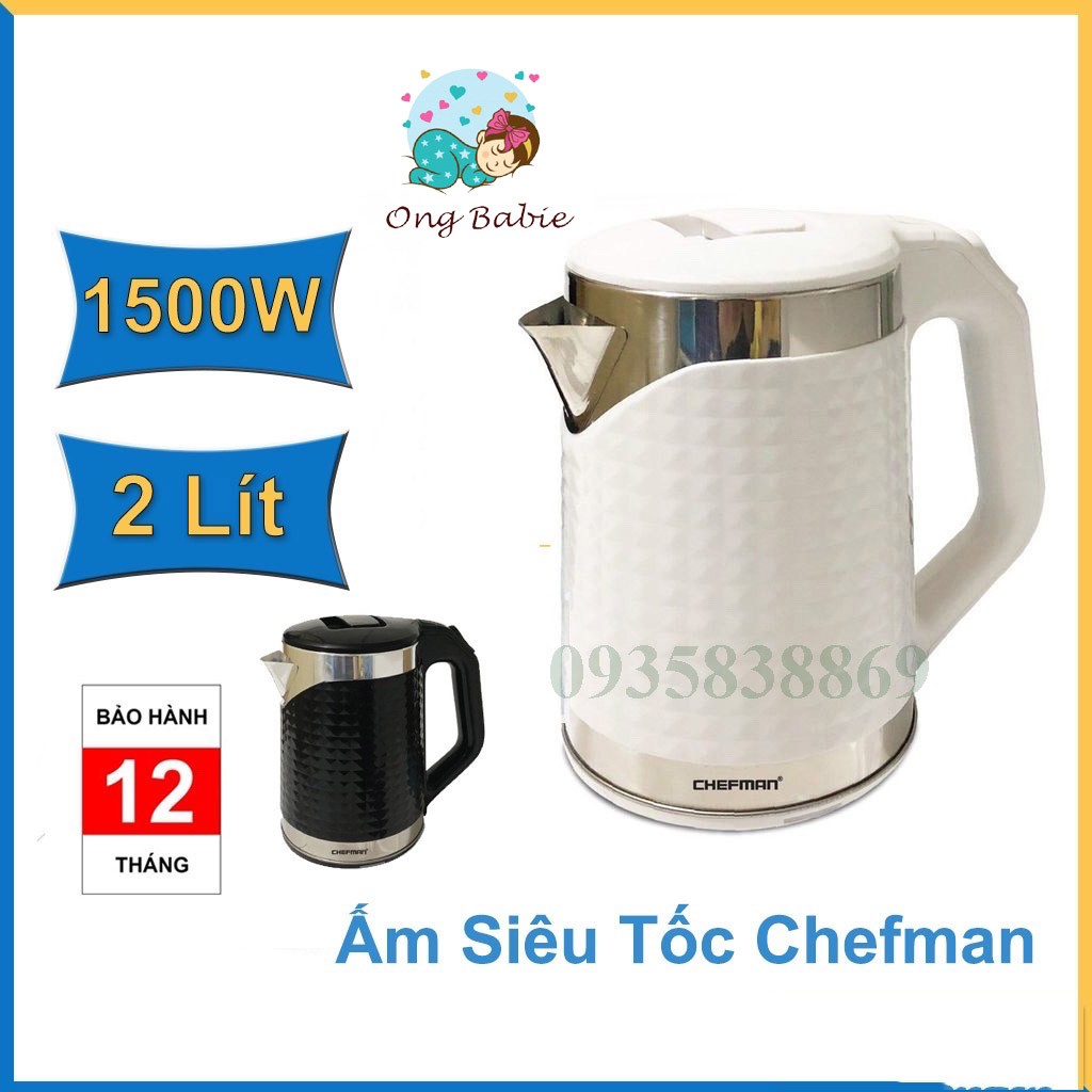 - Ấm siêu tốc Chefman CM-720 hoạt động với công suất 1500W, sử dụng nguồn điện áp 220V/50Hz giúp đun nước sôi rất nhanh, chỉ sau vài phút là đã có nước nóng để pha mì, pha trà hay pha sữa cho bé....