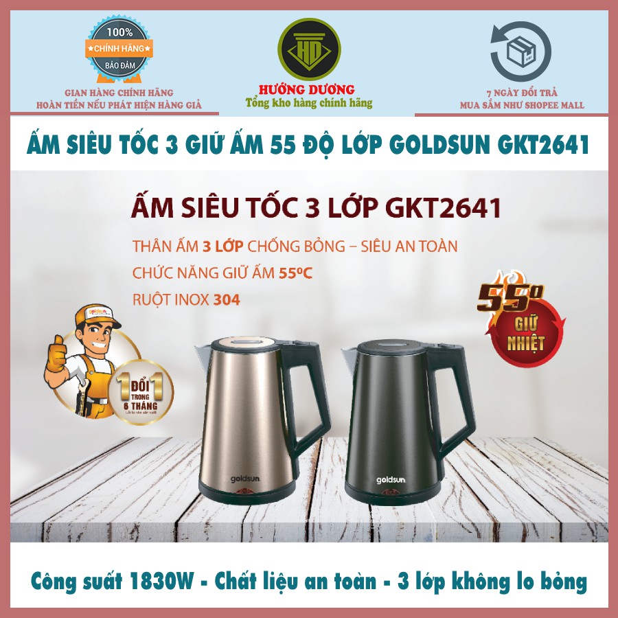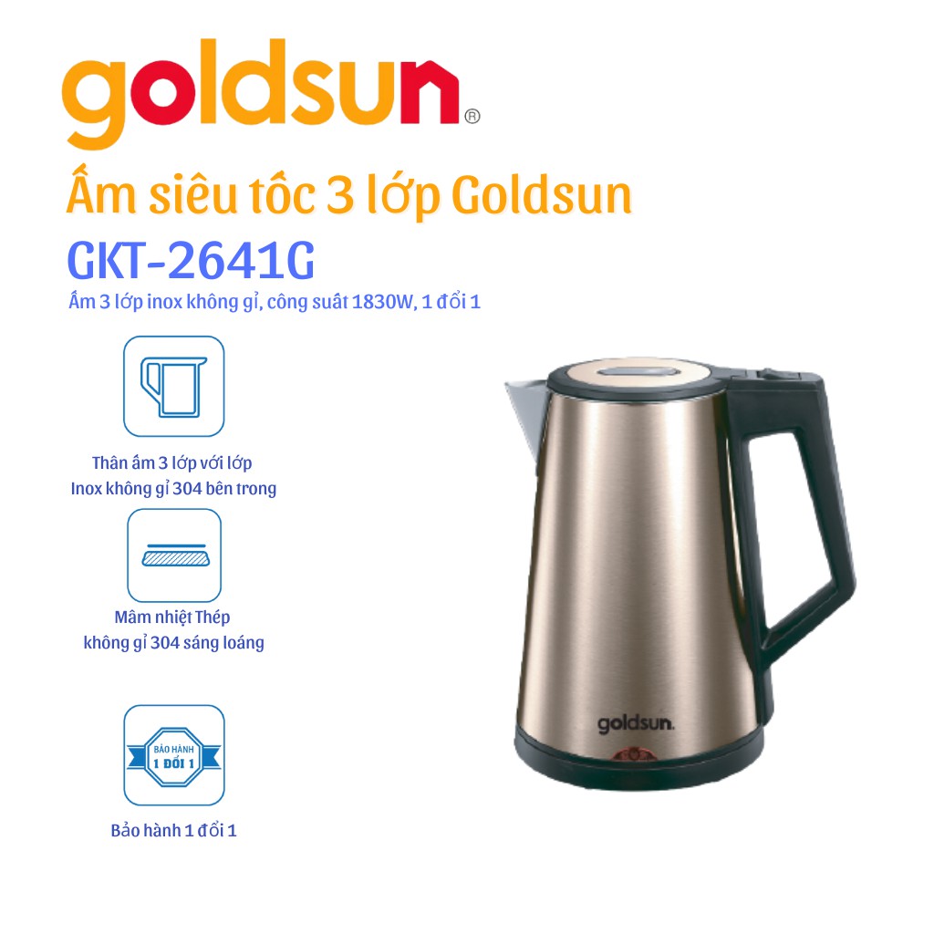 Ấm siêu tốc 3 Lớp giữ ấm 55 độ Goldsun GKT2641G bảo hành 12 tháng Hàng chính hãng