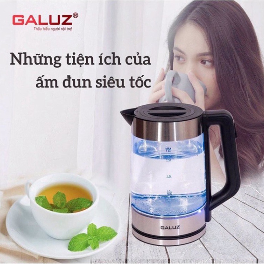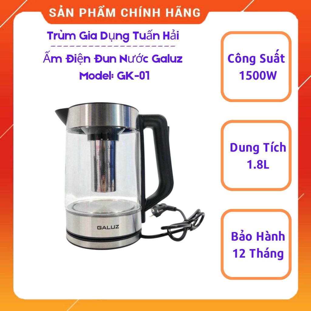 - Ấm điện đun nước thủy tinh 1.8L Galuz Gk-01 với thiết kế sang trọng, tinh tế. Ngoài ra công suất 1500W khả năng đun sôi nhanh chóng giúp bạn pha những bình trà, cafe, nấu mì… chỉ trong ít phút.