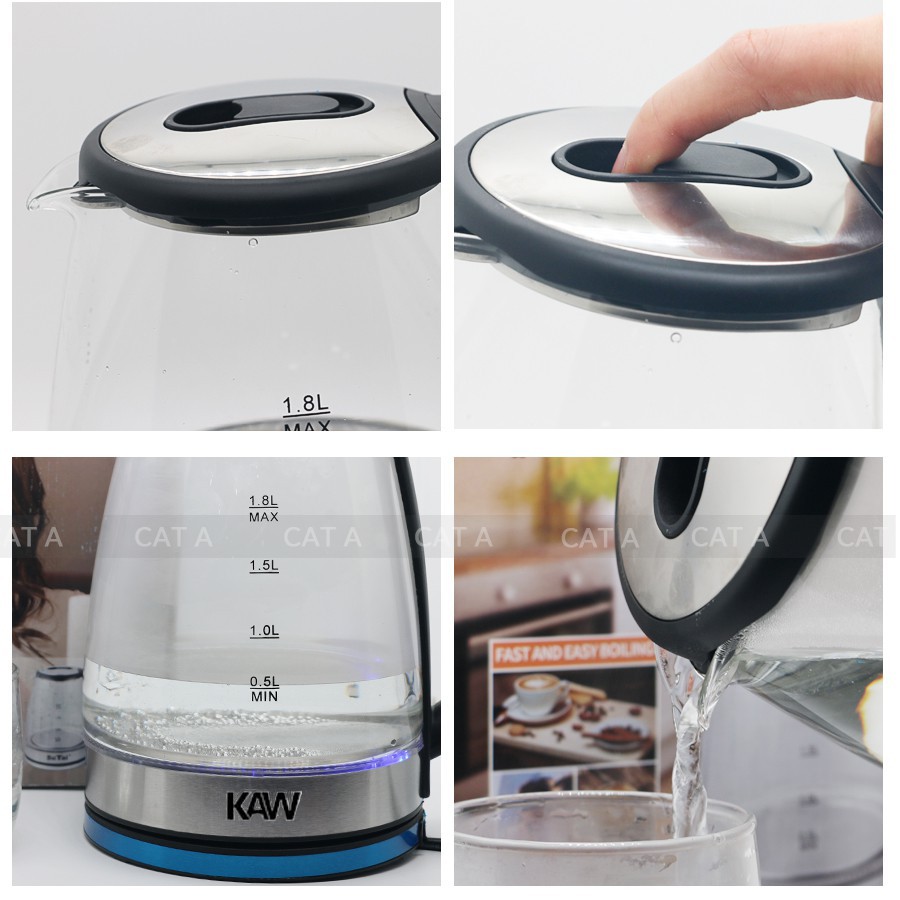 - Ấm siêu tốc thủy tinh KAW sang trọng, tinh tế với thiết kế thân bình được làm bằng thủy tinh trong suốt cao cấp có khả năng chịu nhiệt tốt và an toàn tuyệt đối cho sức khỏe của người sử dụng.