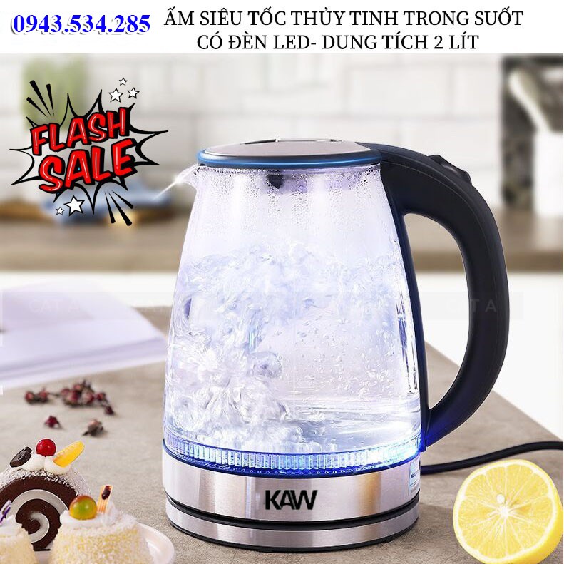 ấm siêu tốc, bình đun siêu tốc thủy tinh trong suốt CAO CẤP KAW Dung tích 2.0L - tiết kiệm điện, đun siêu tốc, có đè