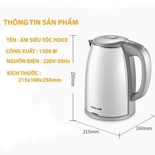 Ấm siêu tốc, Bình đun nước siêu tốc Yoice dung tích 1,8L chất liệu 2 lớp inox 304 công suất mạnh mẽ 1500W POT KITCHENTHÔNG TIN SẢN PHẨM: