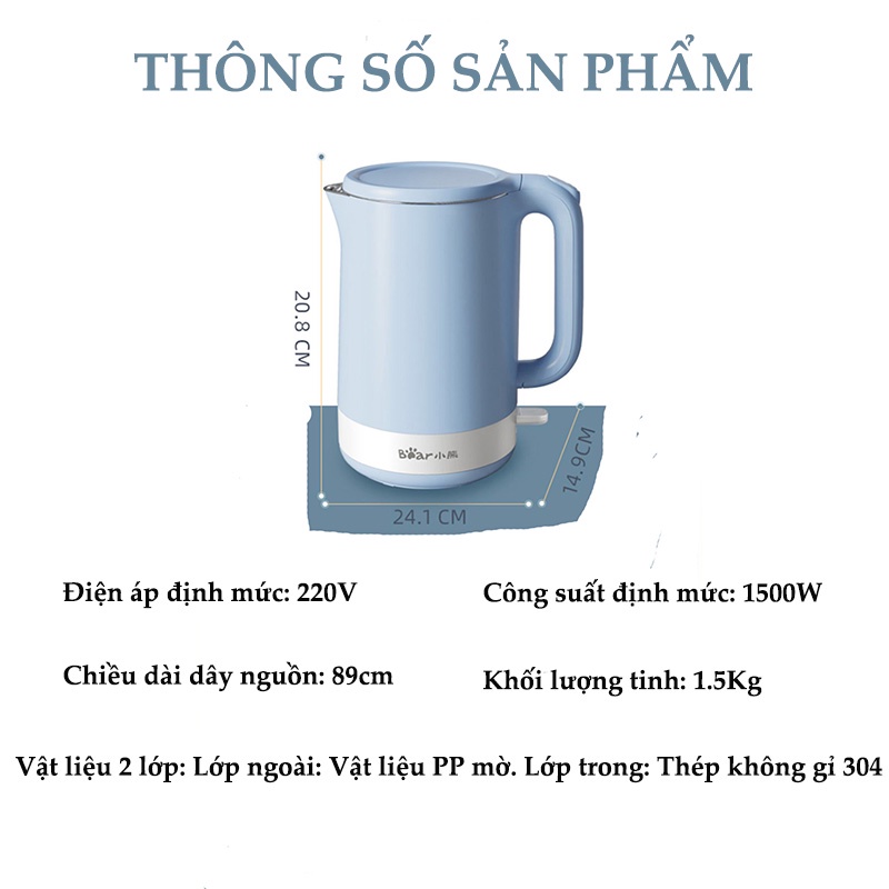 Ấm siêu tốc, bình đun nước siêu tốc, ấm đun nước dung tích 1.5L chính hãng Bear - LB259211✨ Thông tin sản phẩm: