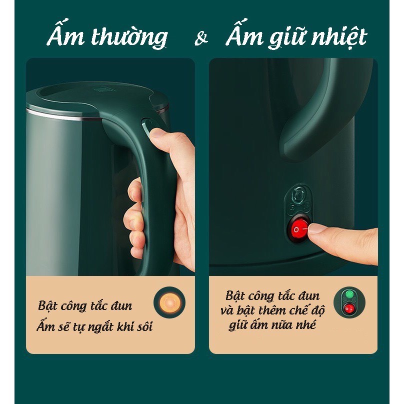 👉 Đèn tự động báo hiệu bật/tắt: Ấm trang bị đèn LED hiển thị bật/tắt điện an toàn, giúp người dùng dễ dàng nhận biết hoạt động của ấm.
