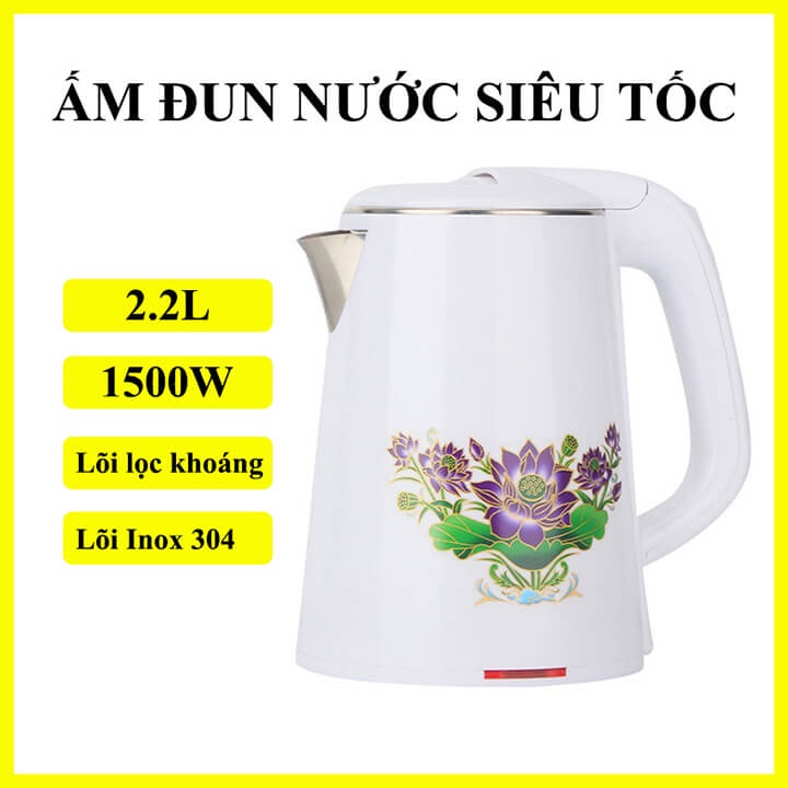 Ấm siêu tốc, bình đun siêu tốc inox 2.2l lõi lọc khoáng đun nước an toàn tuyệt đối, công suất 1500W