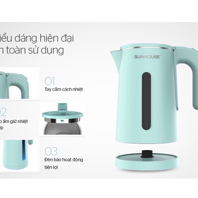 - Màu sắc xanh pasel vô cùng thời thượng, ấm siêu tốc sunhouse shd1351 không chỉ là một thiết bị nhà bếp mà còn đem đến tính thẩm mĩ cho căn bếp của bạn.