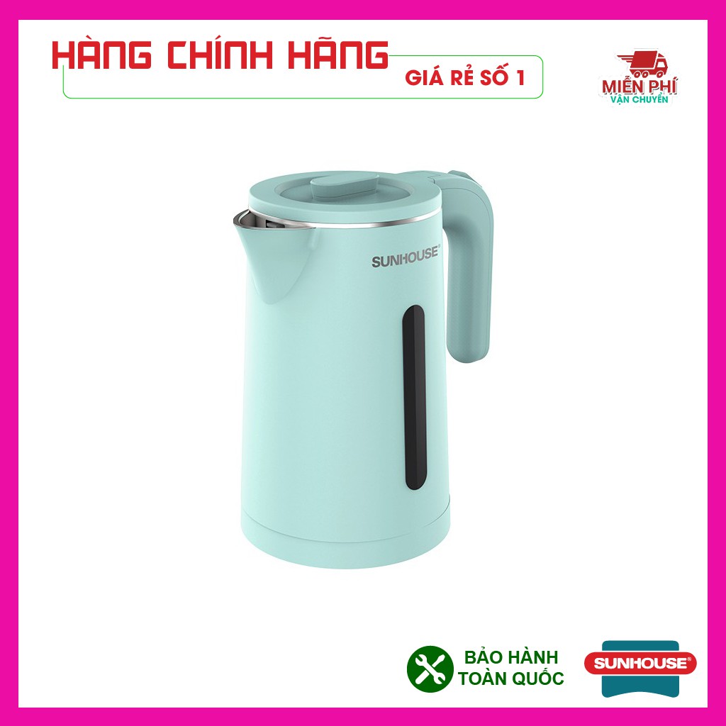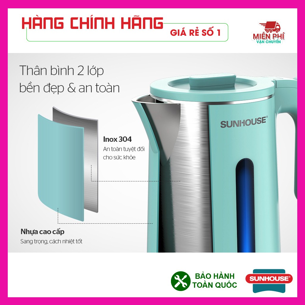 Ấm siêu tốc, bình đun siêu tốc, Inox 2 lớp Sunhouse, 1,8 lit, tự ngắt khi sôi, bảo hành chính hãng 12 tháng.
