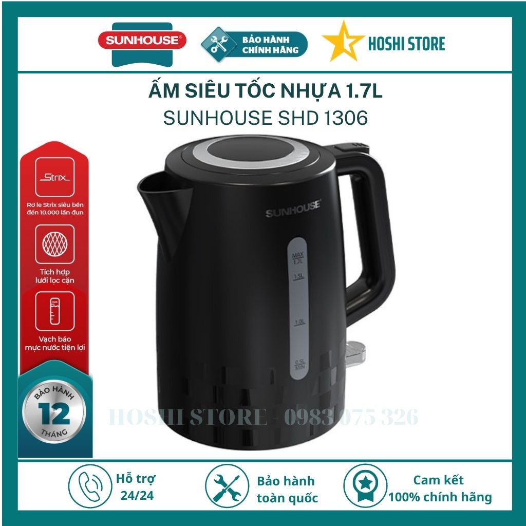 Giới thiệu Ấm siêu tốc, bình siêu tốc nhựa cao cấp 1.7L SUNHOUSE SHD1306, bảo hành toàn quốc 12 tháng