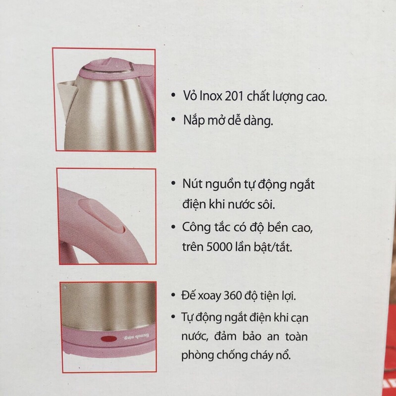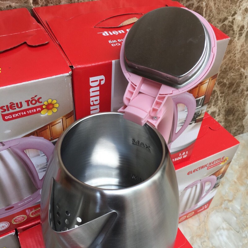 Giới thiệu Ấm Siêu Tốc Điện Quang Inox 201, nhựa PP không mùi, an toàn cho sức khỏe, màu hồng, nâu, đỏ xanh ĐQ EKT07