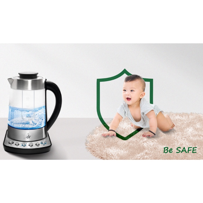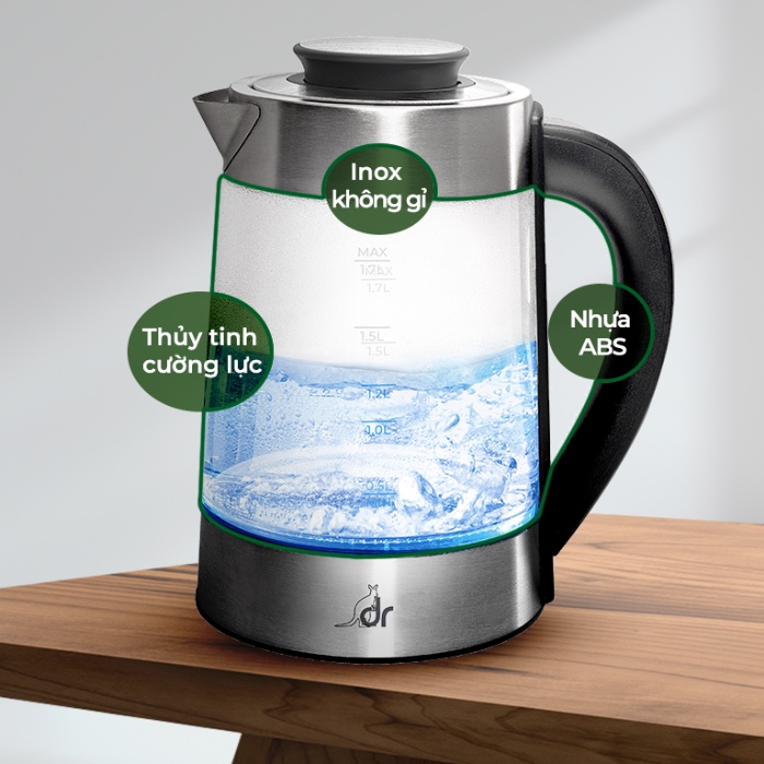 Thân bình đun nước thông minh được làm từ Thuỷ tinh Borosilacate, có khả năng chịu và chống sốc nhiệt tốt hơn bất kỳ loại thủy tinh thông thường khác, bền đẹp theo thời gian. Ngoài ra, bình đun thủy tinh siêu tốc được kết hợp Inox không gỉ (304), nhựa ABS (BPA Free) an toàn với nhiệt độ, đảm bảo sức khoẻ người dùng giúp an tâm hơn khi sử dụng