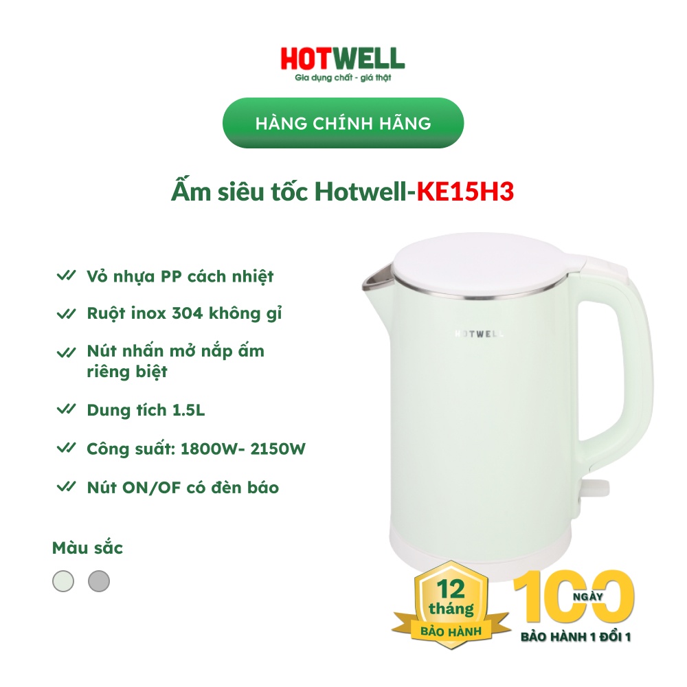 Giới thiệu Ấm siêu tốc Hotwell KE15H3 - 1.5L, 2150W đun sôi siêu nhanh, tự ngắt điện chống cháy nổ, vỏ ngoài PP cách nhiệt chống bỏ
