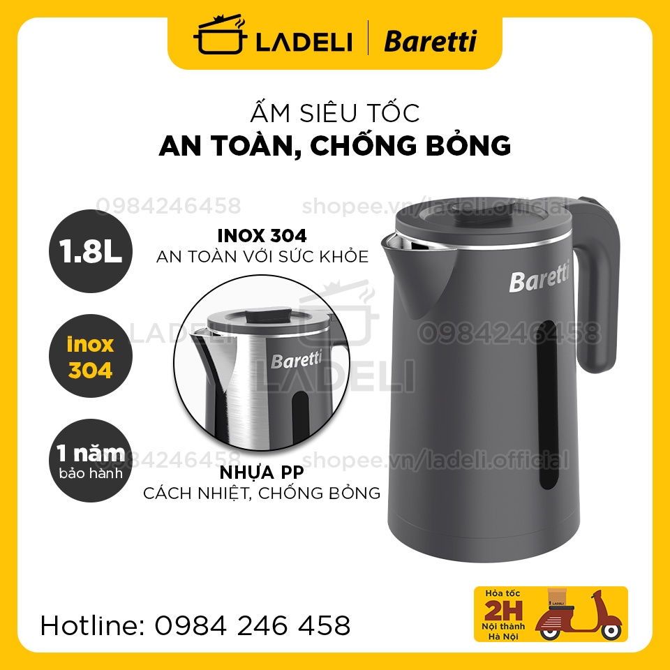 Giới thiệu Ấm siêu tốc inox 1.8L Baretti BRD182 bọc nhựa PP chống bỏng | LADELI - Bảo hành tại SUNHOUSE