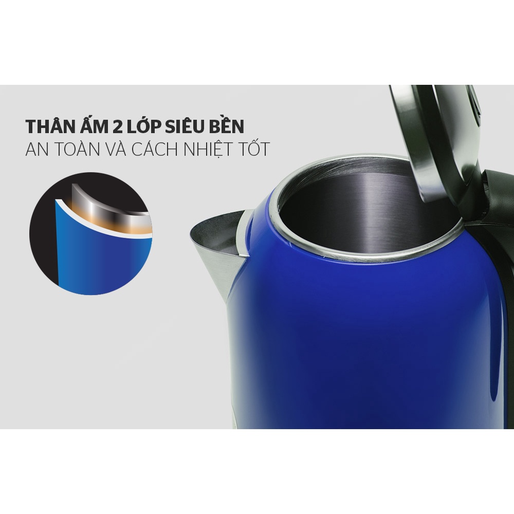 Ấm có chế độ ngắt tự động khi nước sôi, cạn nước hoặc ấm quá nóng, đảm bảo an toàn tối đa cho người sử dụng (quên/bận rộn công việc khác). Chức năng này còn giúp làm tăng tuổi thọ sản phẩm và phòng chống cháy nổ.