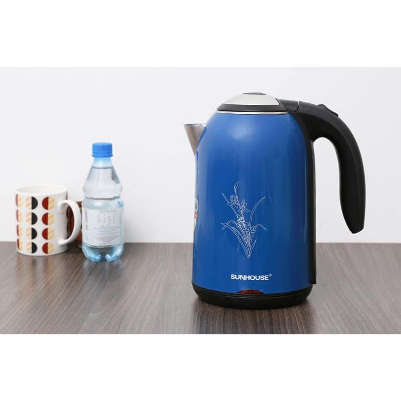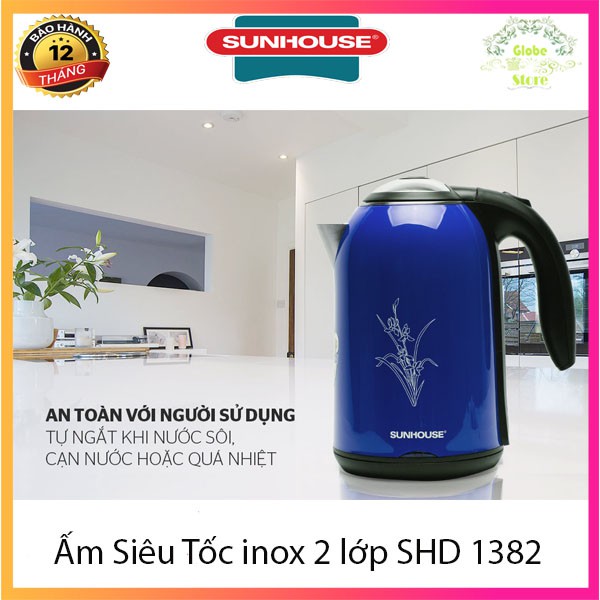 + Ấm Siêu Tốc Inox 2 lớp Cách Nhiệt Sunhouse SHD 1382 inox 2 lớp 1.7 L SUNHOUSE SHD1382R màu đỏ và SHD1382B màu xanh lam là sự lựa chọn phù hợp cho những căn bếp hiện đại. Ấm có dung tích lớn 1.7 lít cùng công suất hoạt động cao (1800W) giúp việc đun nước nhanh chóng hơn, tiết kiệm thời gian và điện năng tối đa.