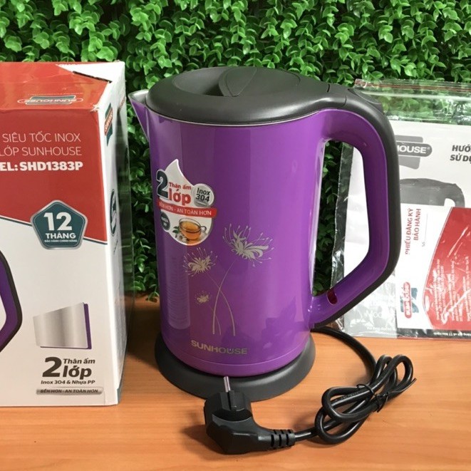 ẤM SIÊU TỐC là một sản phẩm thiết yếu trong mỗi căn nhà Việt, chúng có tần suất sử dụng thường xuyên; dùng nguồn điện 220 V để đun sôi nước nên yếu tố AN TOÀN luôn được đặt lên hàng đầu. HIỂU được điều này, Công ty chúng tôi giới thiệu tới Qúi khách hàng thân yêu sản phẩm ẤM SIÊU TỐC inox 2 lớp SUNHOUSE SHD1383P- Màu Tím của Tập đoàn Sunhouse.*** ĐẶC ĐIỂM NỔI BẬT của ẤM SIÊU TỐC inox 2 lớp SUNHOUSE SHD1383P