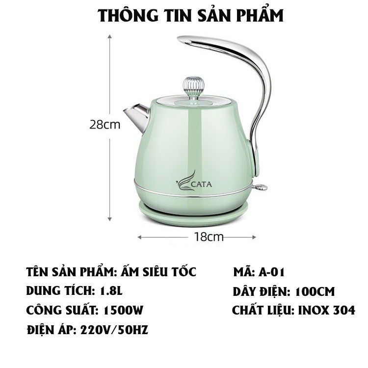 Ấm siêu tốc inox 304 CÁT Á, công suất 1500W, đun siêu nhanh siêu tiết kiệm điện - Bảo hành 1 năm
