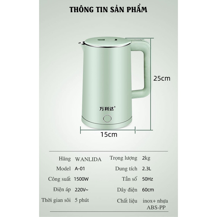 Ấm Siêu Tốc Inox A-01 (Dung Tích Lớn 2.3L) - Bình Siêu Tốc 1500W Đun Sôi Nhanh Vỏ nhựa PP an toàn, Lõi thép không gỉ.1.THÔNG SỐ KỸ THUẬT ẤM SIÊU TỐC :