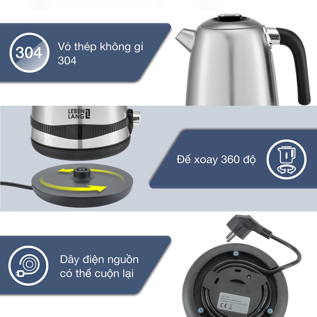 Ấm siêu tốc inox bình siêu tốc inox LEBENLANG LBE2662 điều khiển nhiệt độ, bảo hành đổi mới trong 2 năm- Dung tích: 1,7L