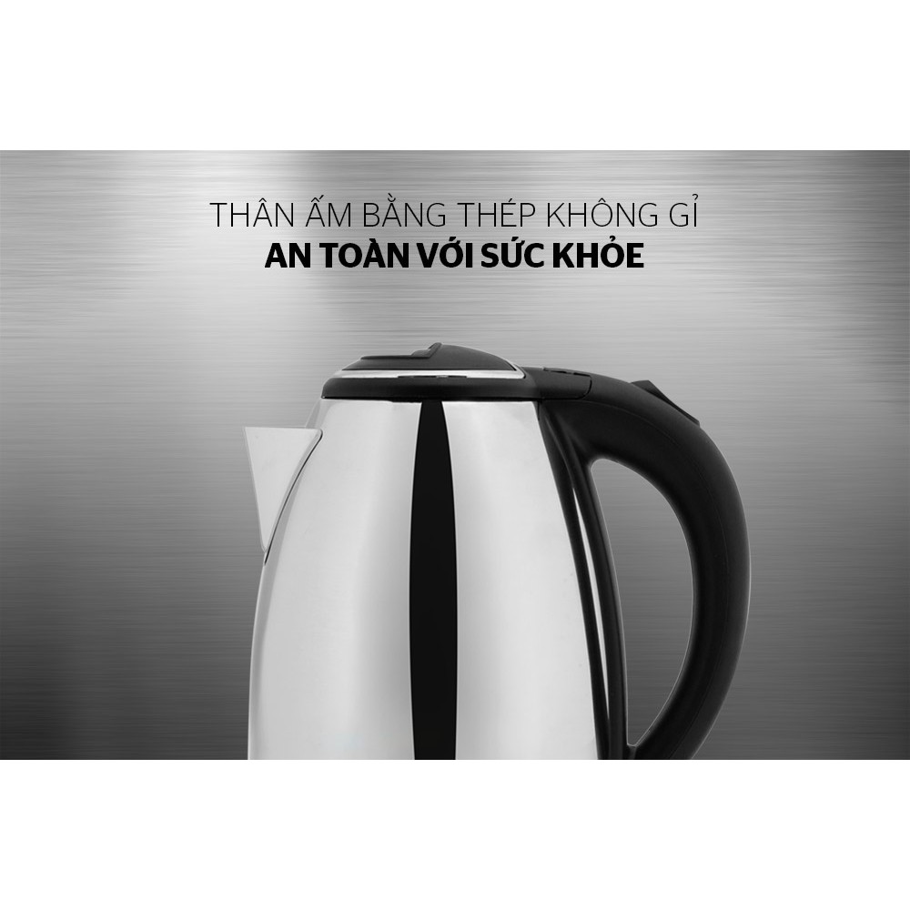 Ấm có chế độ ngắt tự động khi nước sôi hoặc cạn nước, đảm bảo an toàn tối đa cho người sử dụng (quên/bận rộn công việc khác). Chức năng này còn giúp làm tăng tuổi thọ sản phẩm và phòng chống cháy nổ.