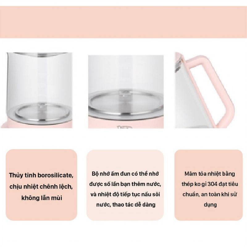 - Ấm được làm từ thủy tinh borosilicate, chịu được sự chênh lệch nhiệt độ, không lẫn mùi.