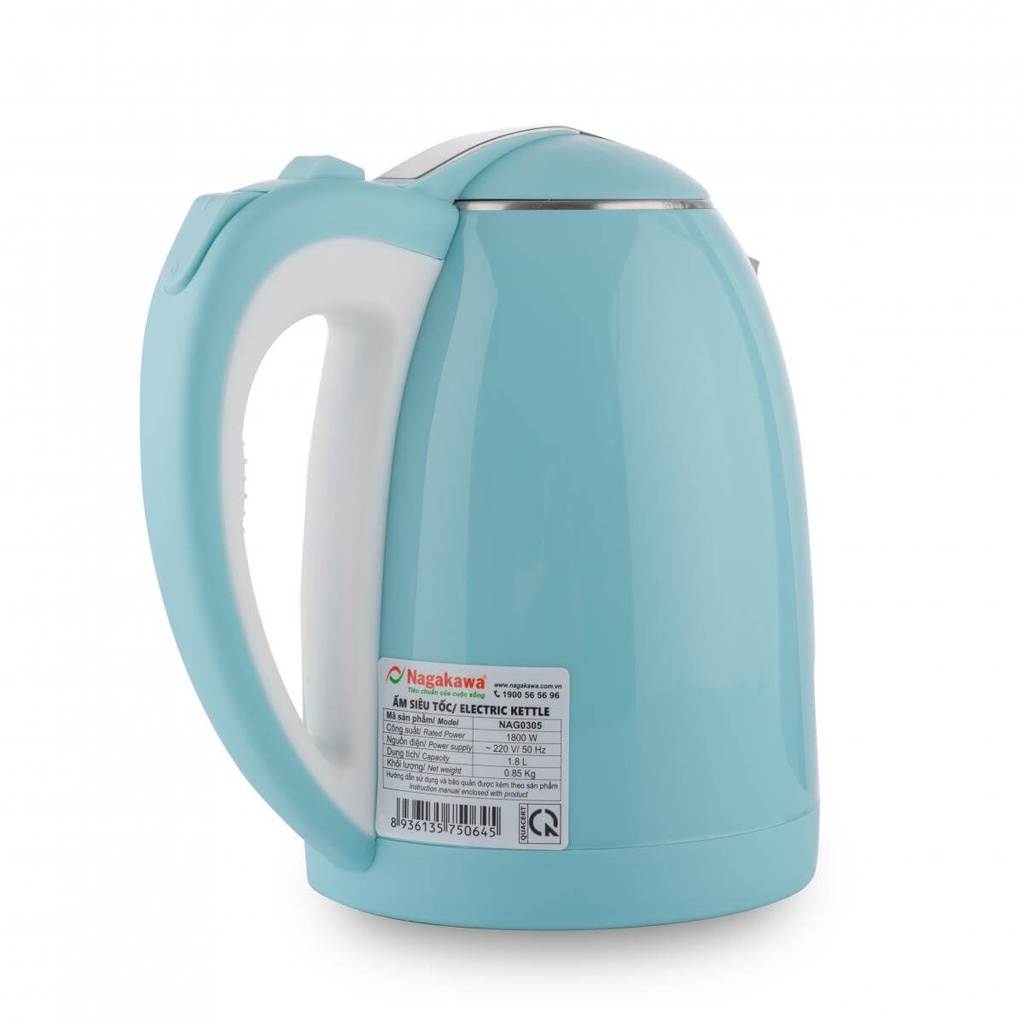 Nagakawa NAG0305 là bình đun nước siêu tốc có thể tự ngắt khi quá nhiệt hay khi nước sôi, để bạn không cần phải kiểm soát quá trình hoạt động đun sôi đang diễn ra, vừa tiết kiệm thời gian, vừa tiện ích cho người sử dụng và đảm bảo an toàn, tăng tuổi thọ sản phẩm. Công suất 1800W giúp đun nấu nhanh hơn, bạn sẽ không phải chờ đợi lâu như khi đun nấu nước trên bếp gas. Dung tích 1,8 lít dư giả để có thể sử dụng được nhiều hơn hoặc có thể lưu trữ nước nóng/nước ấm vào bình giữ nhiệt để dùng dần.