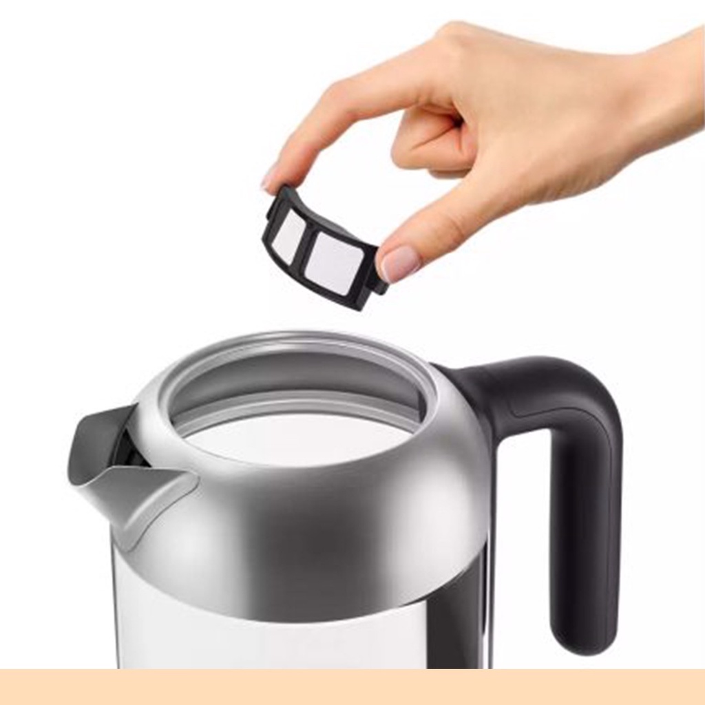 Một bộ lọc lưới vi mô có thể tháo rời trên vòi sẽ bắt giữ các hạt limescale nhỏ đến 200 micron để đảm bảo cốc trong suốt.