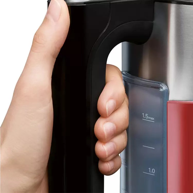 Tay cầm của ấm được thiết kế cứng cáp và chắc chắn có khả năng cách nhiệt cực tốt không bị nóng khi đun nước. Ngoài ra sản phẩm này còn có một bộ phận báo mực nước trong suốt giúp người dùng dễ dàng quan sát mực nước bên trong ấm.#amsieutoc #amsieutocsiemens #amsieutocsiemenstw86104p #siemens #siemenstw86104p