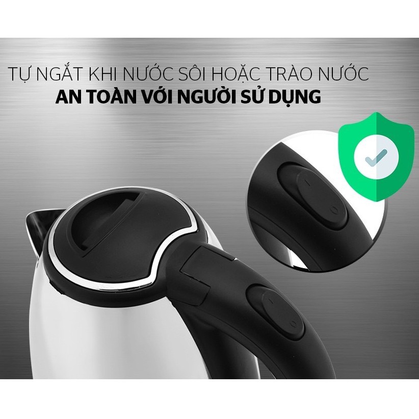 Ấm có chế độ ngắt tự động khi nước sôi hoặc cạn nước, đảm bảo an toàn tối đa cho người sử dụng (quên/bận rộn công việc khác). Chức năng này còn giúp làm tăng tuổi thọ sản phẩm và phòng chống cháy nổ.