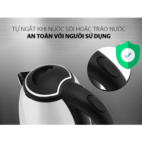 Ấm có chế độ ngắt tự động khi nước sôi hoặc cạn nước, đảm bảo an toàn tối đa cho người sử dụng (quên/bận rộn công việc khác). Chức năng này còn giúp làm tăng tuổi thọ sản phẩm và phòng chống cháy nổ.