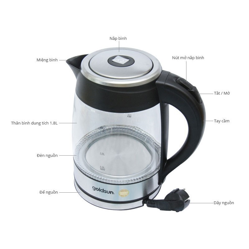 - Dung tích 1.8L giúp đun được nhiều nước cho mỗi lần sử dụng