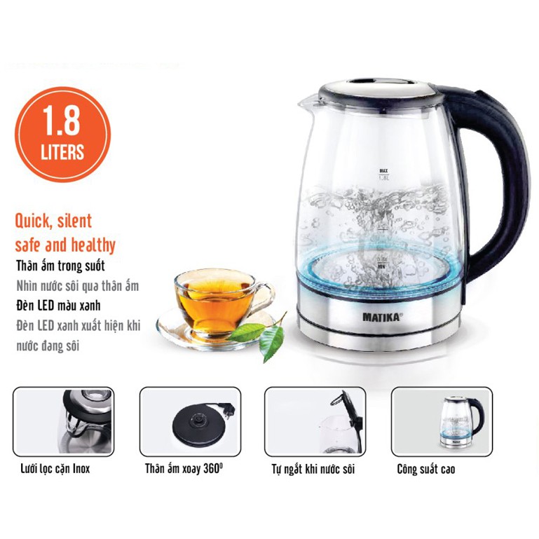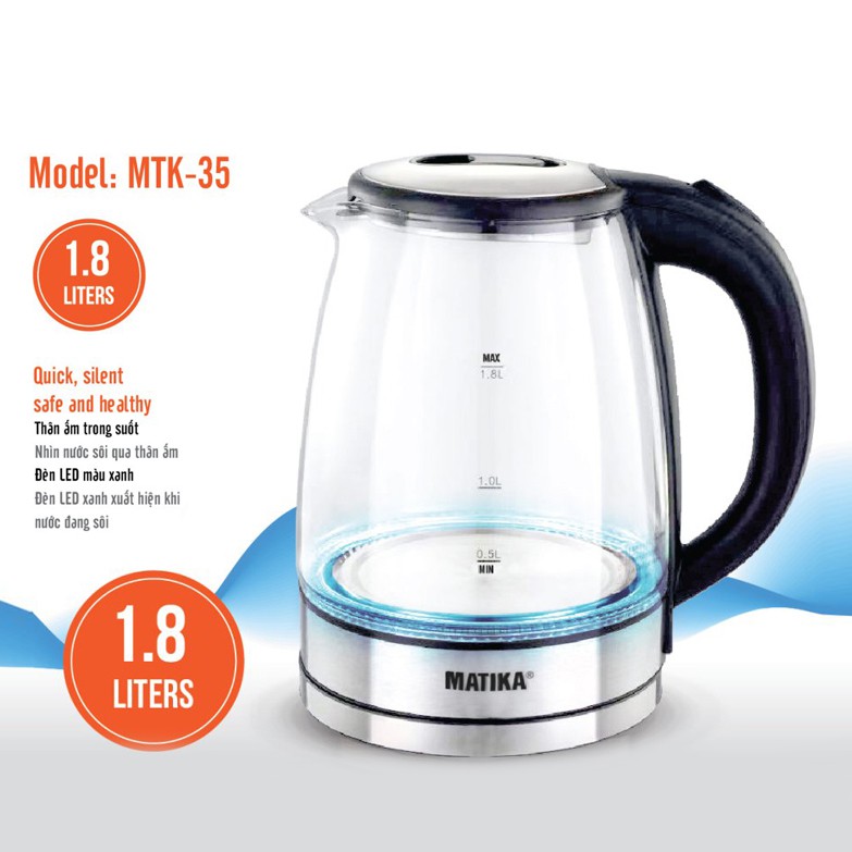 Giới thiệu [Mã ELHADEV giảm 4% đơn 300K] Ấm siêu tốc thủy tinh 1.8L Matika MTK-35 thân ấm chịu được nhiệt độ cao, chống va đập