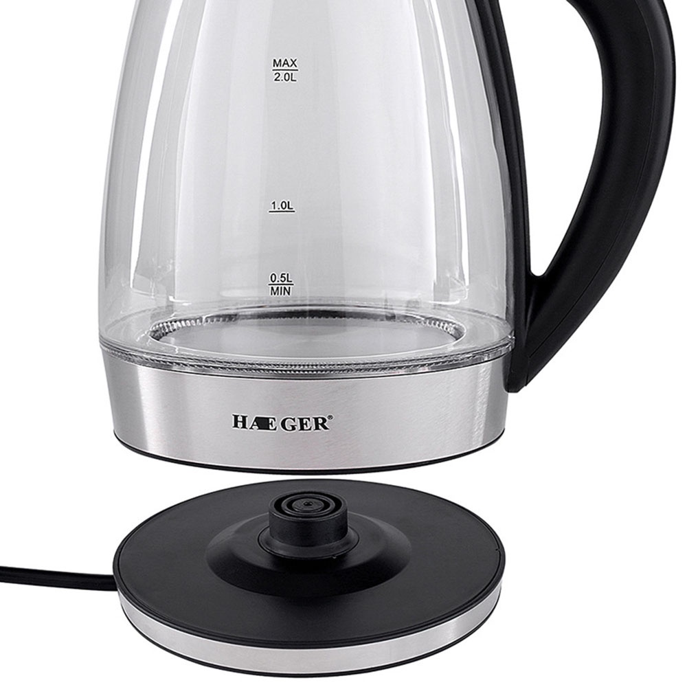 Ấm siêu tốc thủy tinh 2L, bình đun nước HAEGER công suất lớn, nước sôi chỉ 4 phút, làm ấm pha trà sang trọng, tiện lợi.