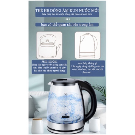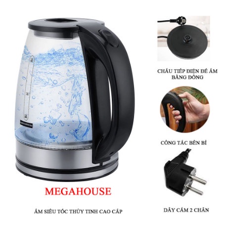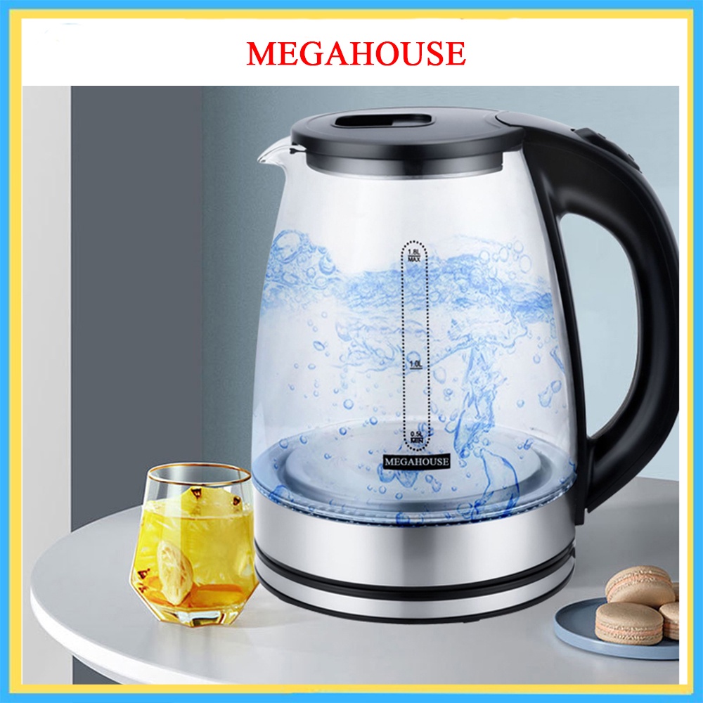 Ấm siêu tốc thủy tinh cao cấp 1.8L MEGAHOUSE 1500w bình siêu tốc trong suốt, cường lực, đèn led, tự ngắt khi sôi.