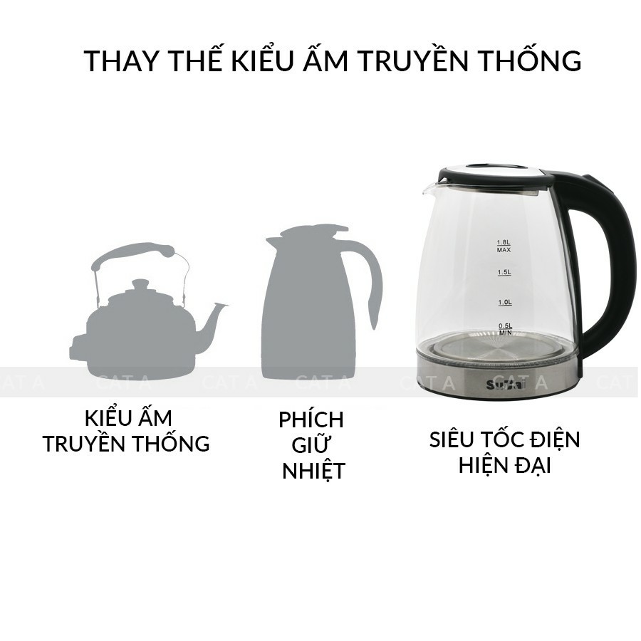 - Ấm siêu tốc thủy tinh SUTAI sang trọng, tinh tế với thiết kế thân bình được làm bằng thủy tinh trong suốt cao cấp có khả năng chịu nhiệt tốt và an toàn tuyệt đối cho sức khỏe của người sử dụng.
