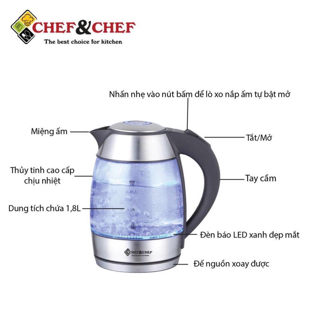 ẤM SIÊU TỐC THỦY TINH CHEF&CHEF CH-1751 BÌNH CHỨA 1.8L CHẤT LIỆU CAO CẤP AN TOÀN KHI SỬ DỤNG