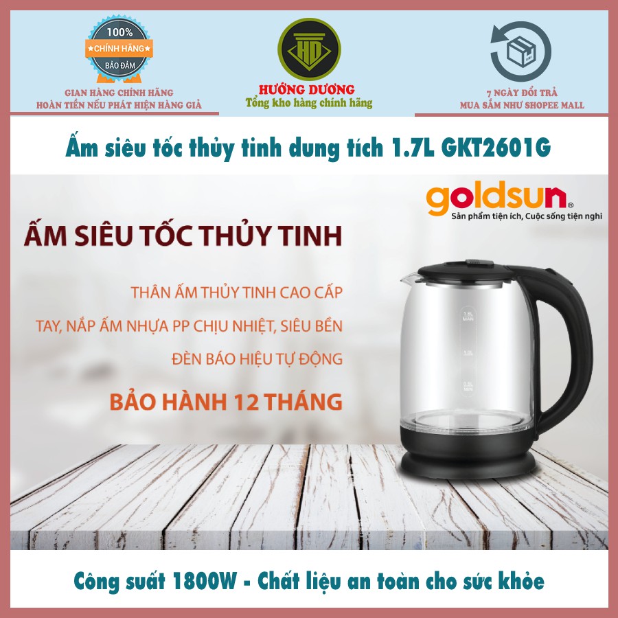 Ấm siêu tốc thủy tinh công suất 1800W Goldsun GKT2601G bảo hành 12 tháng - Hàng Chính Hãng