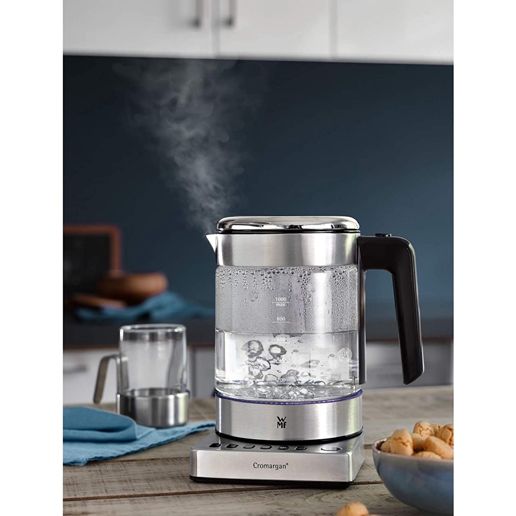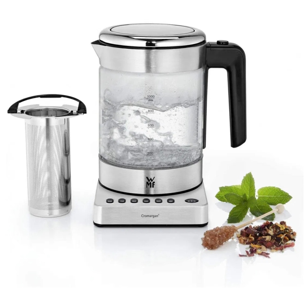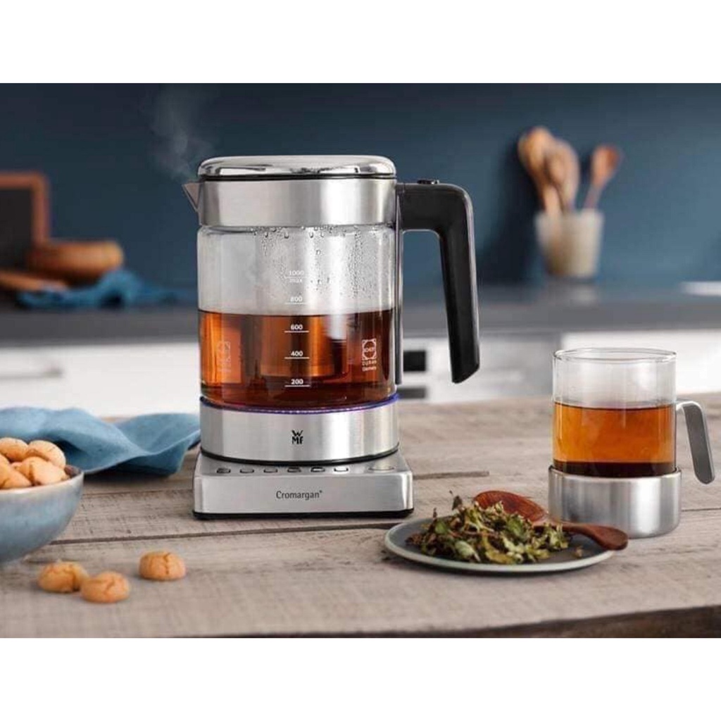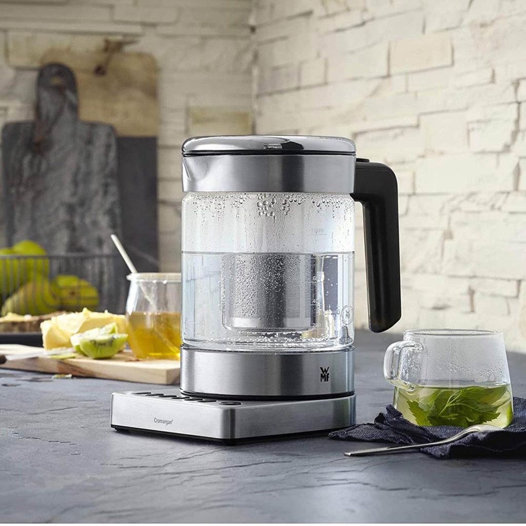 - Mặt kính CromarganWMF cao cấp - khả năng chịu nhiệt cao, dung tích 1 lít, công suất 1.900 watt. 5 mức nhiệt độ: 60 ° C, 70 ° C, 80 ° C, 90 ° C, 100 ° C, bộ lọc vi sinh hương thơm có thể tháo rời, ngăn chứa túi trà tích hợp trong nắp, mở nắp thoải mái bằng một tay, chức năng giữ ấm trong 20 phút, Đèn chiếu sáng nội thất LED, bộ lọc limescale có thể tháo rời.