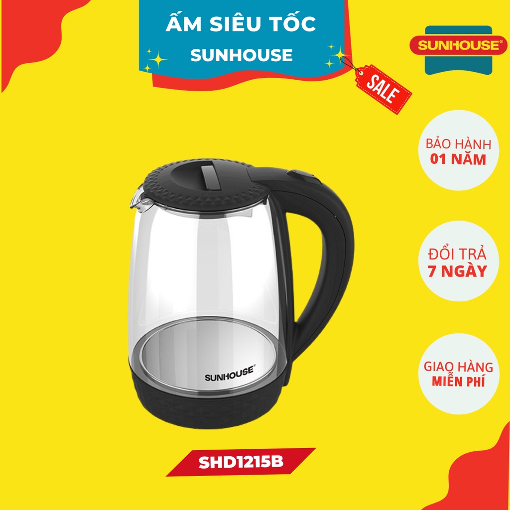 Ấm siêu tốc thủy tinh SUNHOUSE SHD1215B, Thiết kế đèn LED, Miệng rót có khe chống cặn, Tự động ngắt, Bảo hành 12 tháng