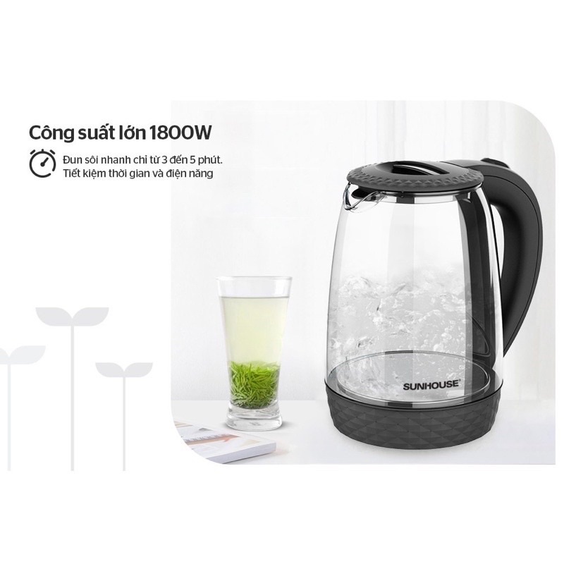 ẤM SIÊU TỐC THUỶ TINH SUNHOUSE DUNG TÍCH 1,8L BẢO HÀNH 12 THÁNG