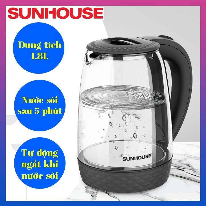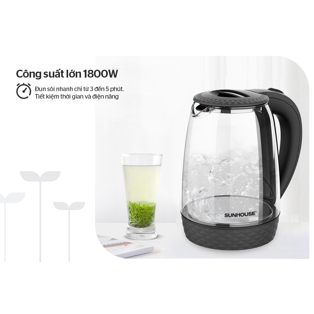 Giới thiệu Ấm siêu tốc thuỷ tinh trong suốt Sunhouse SHD1215 dung tích 1.8L, tự động ngắt điện khi nước sôi, công suất 1800W