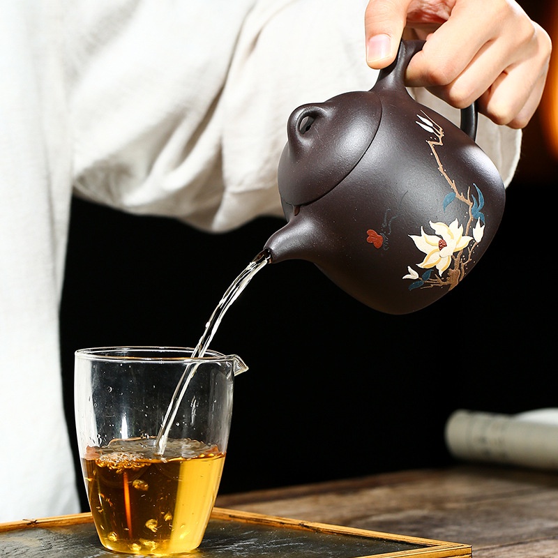 Ấm Tử Sa Nghi Hưng Tần Quyền Lan Hoa 380 ml (Hắc Nê)+ Ấm đẹp, chất đất đanh, mầu ấm tươi, vòi nước dòng chảy tốt.