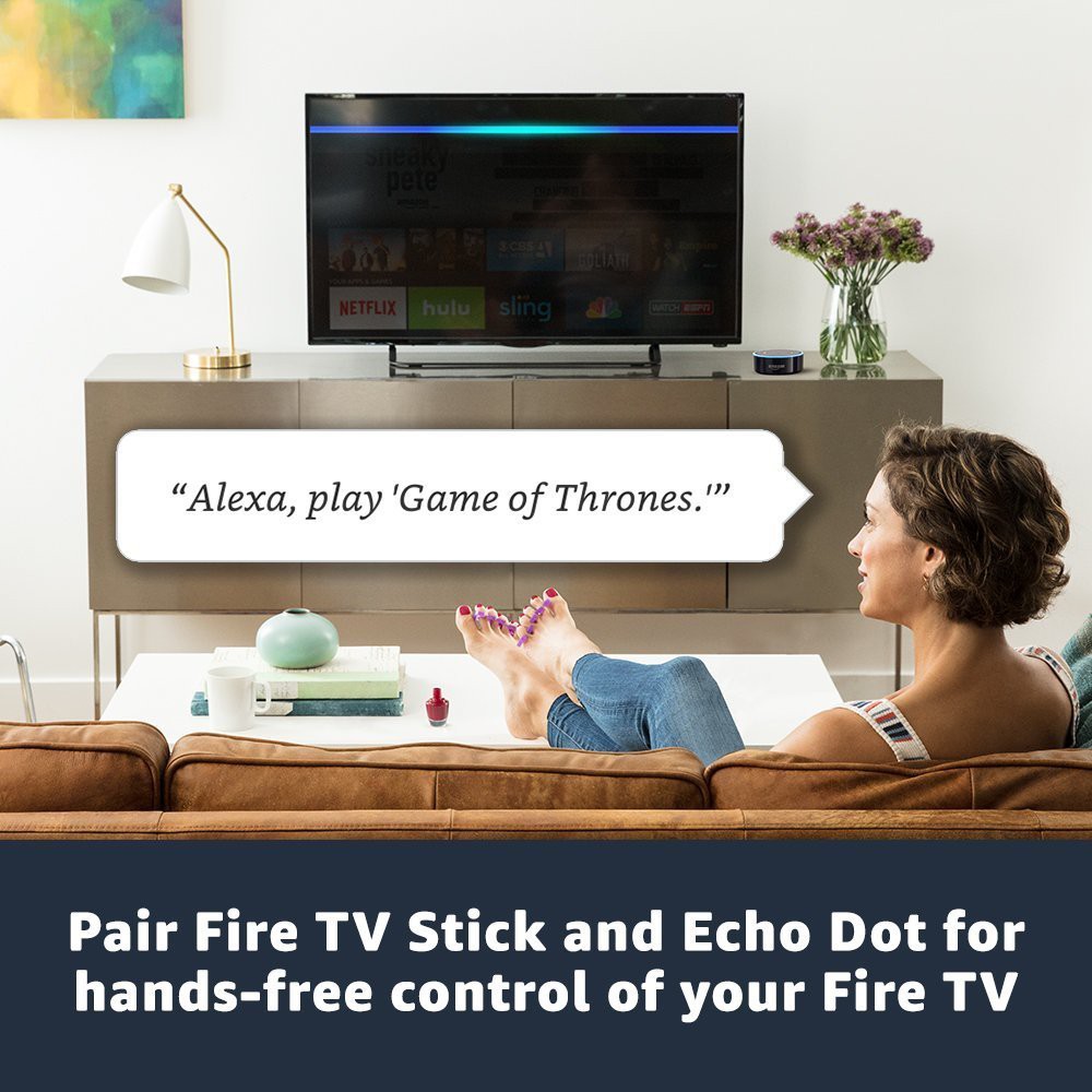 Hơn thế nữa, chỉ việc nhấn nút micro trên với chiếc điều khiển từ xa, bạn có thể yêu cầu phát nhạc từ Pandora hay gọi pizza từ Domino’s, mua thêm bỏng ngô cho những giờ giải trí tuyệt vời. Bạn cũng có thể kết nối Fire TV Stick và thiết bị Echo để điều khiển từ xa, hoàn toàn không cần động tay