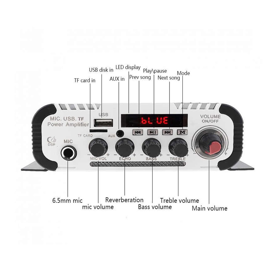 - Hai đầu vào microphone khe cắm, karaoke hệ thống trong nhà của bạn hoặc trong xe hơi. với treble, bass, và điều khiển âm lượng, rất dễ dàng để sử dụng.
